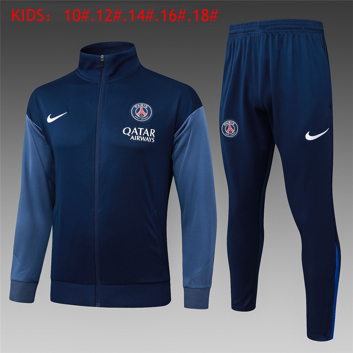 Stay comfy and stylish in the Kids PSG Jacket + Pants Training Suit for the 2025/26 season. Featuring royal blue design, perfect for young soccer enthusiasts.