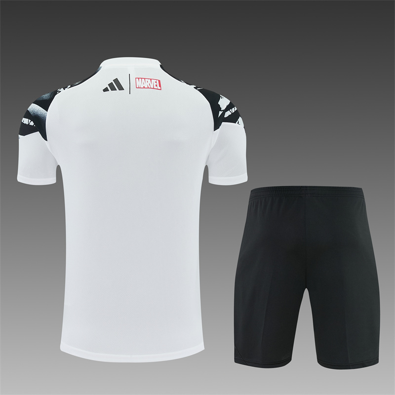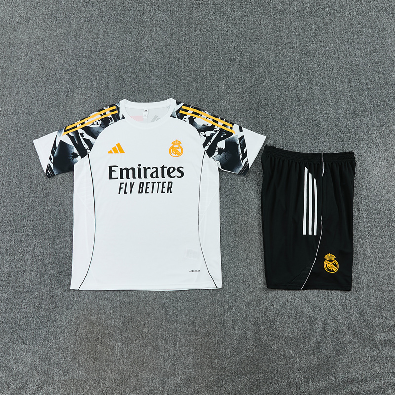 Get your young fan ready in style with the 2025/26 Kids Real Madrid White Training Suit, offering comfort and a sleek look for budding soccer stars.