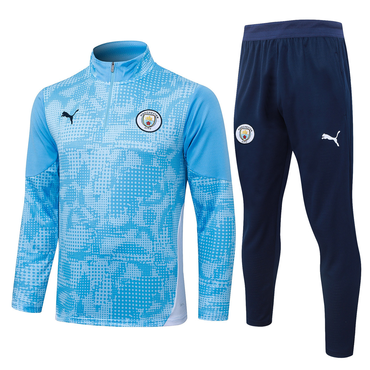 Show your support with the Manchester City Training Suit 2025/26. Light blue patterned design, perfect for comfort and style on or off the field.