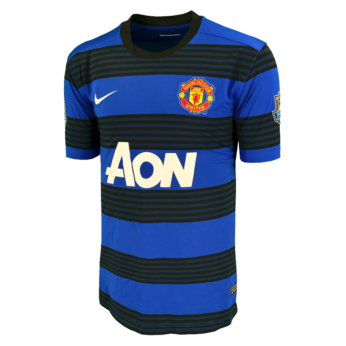 This retro Manchester United away jersey from the 2011/12 season features a classic white design with blue accents and a vintage club crest for a nostalgic touch.